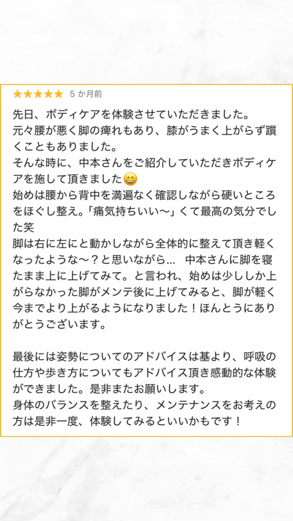 ボディケアで通ってくださっているお客様から素敵なレビューをいただきました☺️